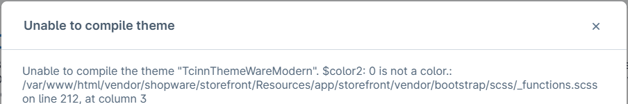 You get the error message `Unable to compile the theme "TcinnThemeWare...". $color2: 0 is not a color`.
